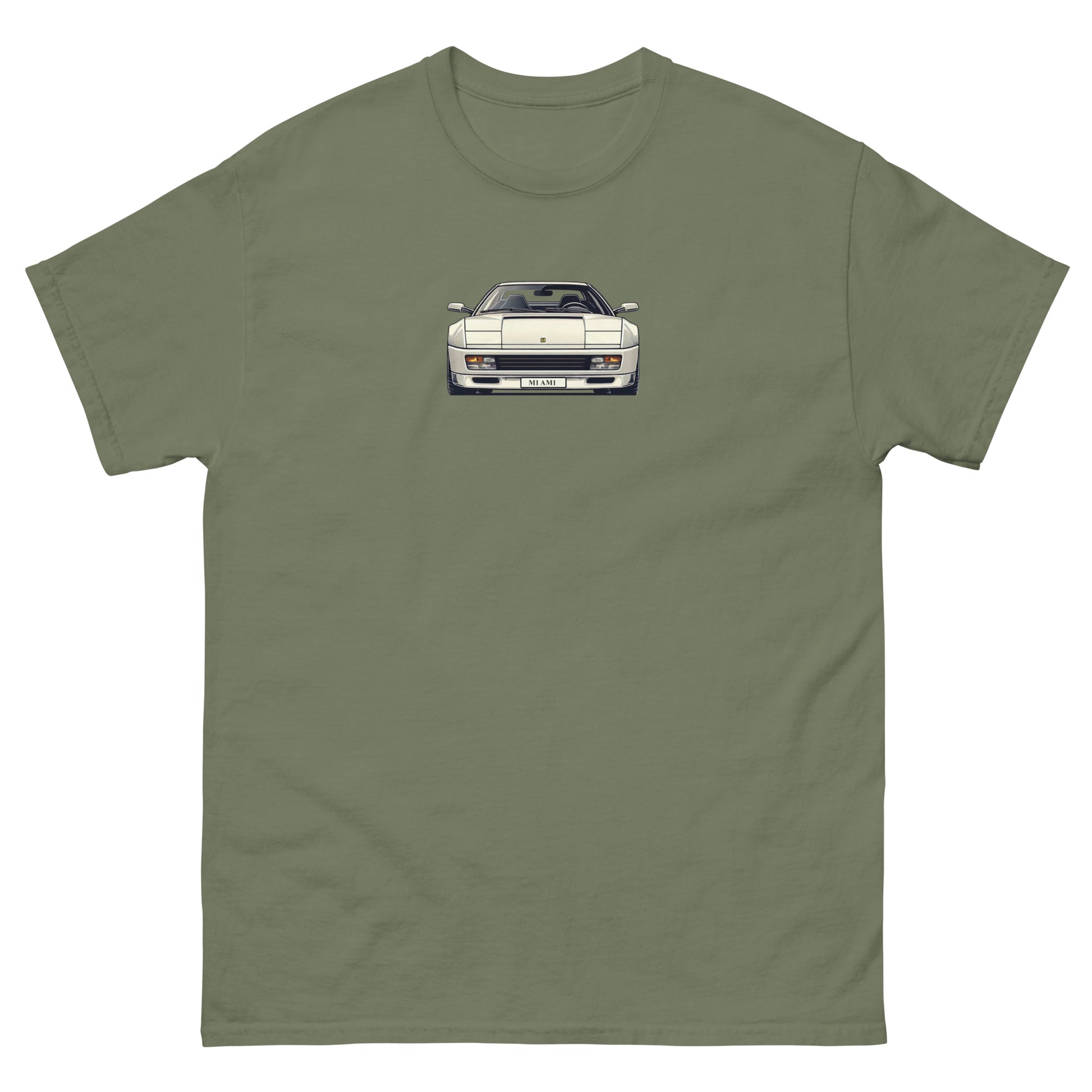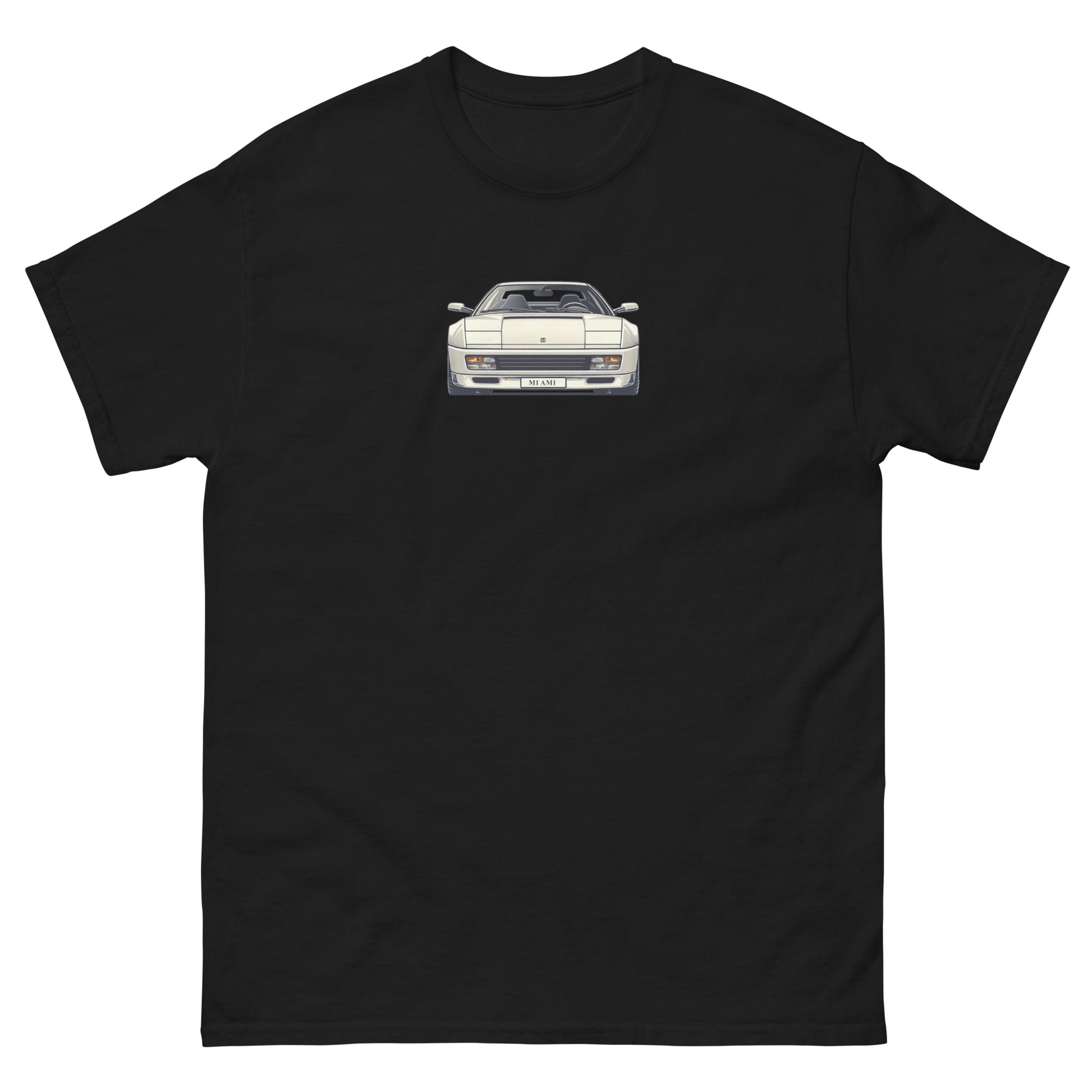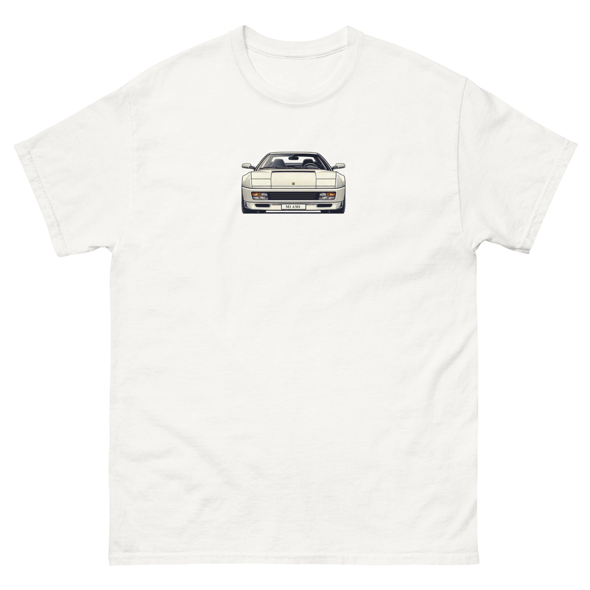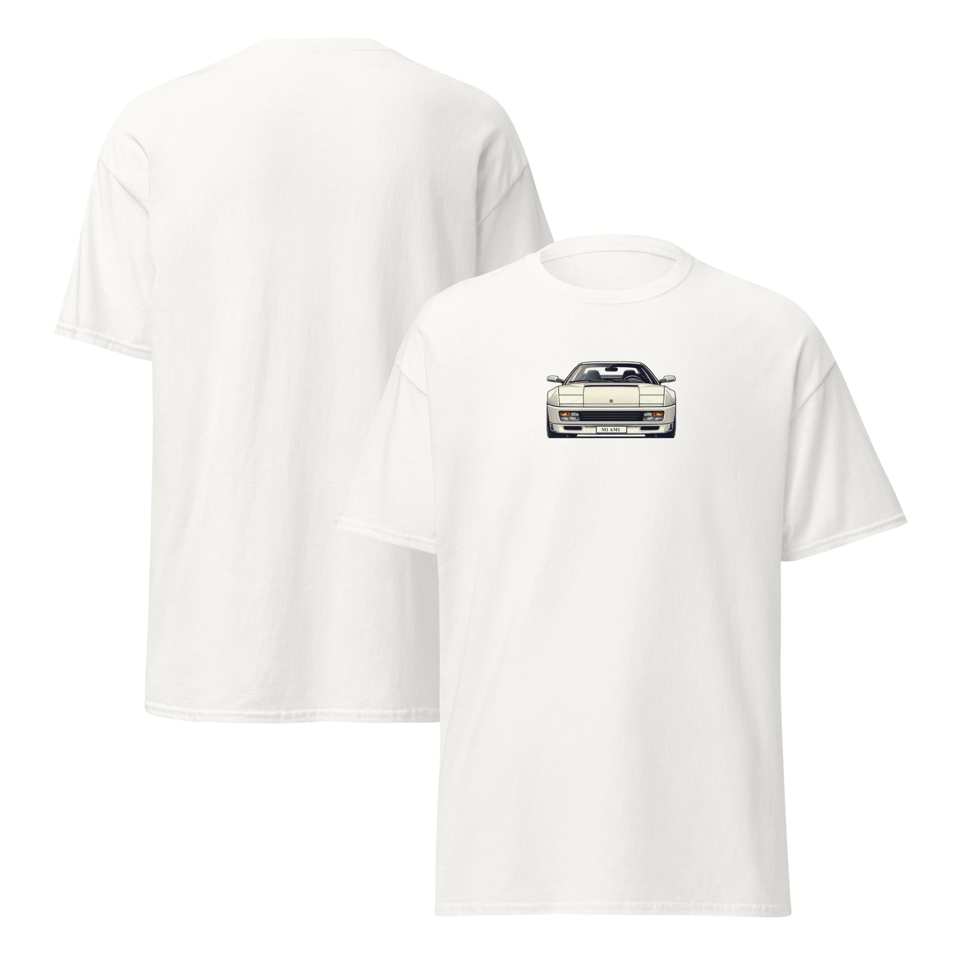 Slip into our white Miami Vice Ferrari Testarossa inspired t-shirt and relive the legendary 80's supercar in all its widebodied, side vented glory! Stylish and fun without breaking the bank, this t-shirt is perfect for any car enthusiast. It sits nicely, maintains sharp lines around the edges, and goes perfectly with layered streetwear outfits.